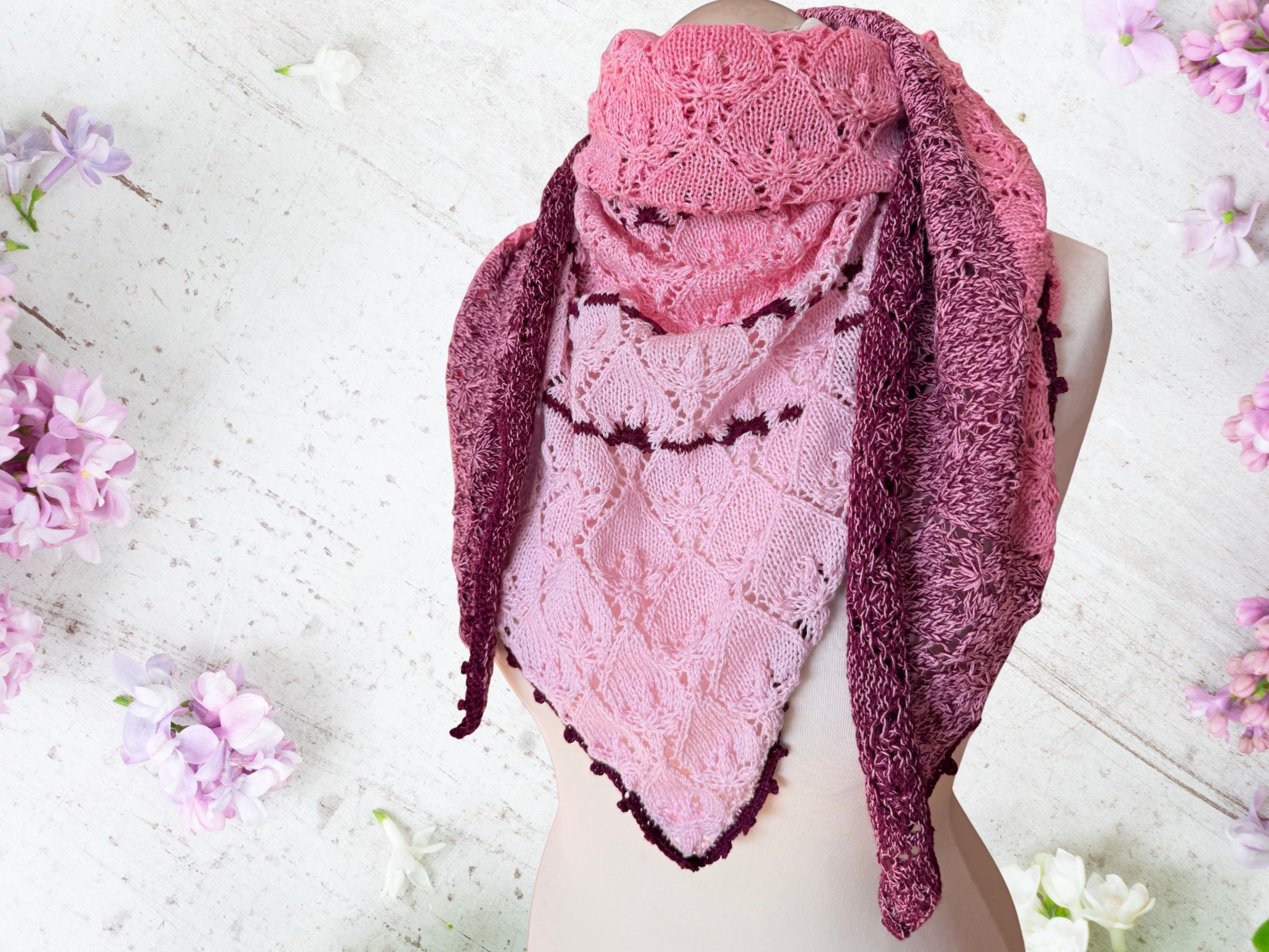 Das Dreieckstuch Fliederknospen wird von der unteren Spitze nach oben gestrickt und zeigt ein zartes, florales Lochmuster, das an kleine Fliederknospen erinnert. Das feine Muster wiederholt sich gleichmäßig über das gesamte Tuch und sorgt für eine elegante, ruhige Struktur.