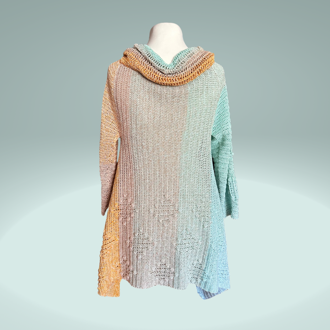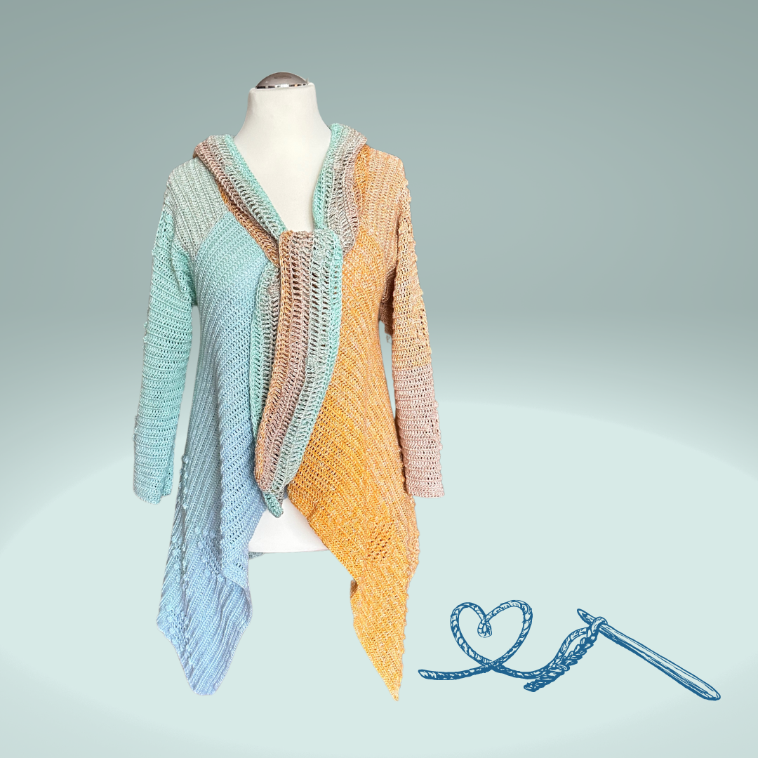 Entdecke mit unserer detaillierten Häkelanleitung die Kunst des seitwärts gehäkelten Mantels mit einem bezaubernden Noppenmuster für die untere Hälfte und die Ärmel. Dieser einzigartige Mantel verleiht dem Farbverlauf des Garns eine besondere Ausstrahlung und fängt die Blicke auf sich.
