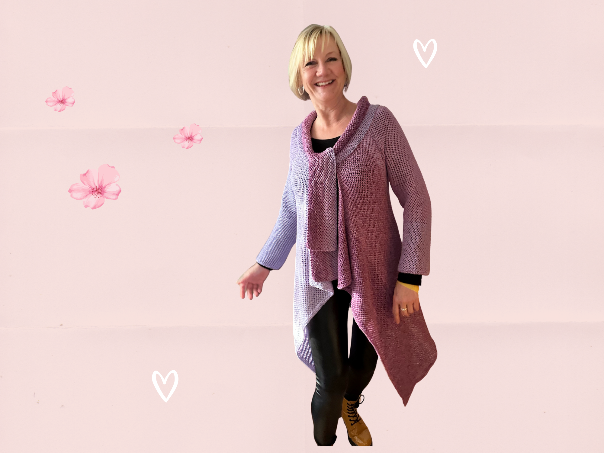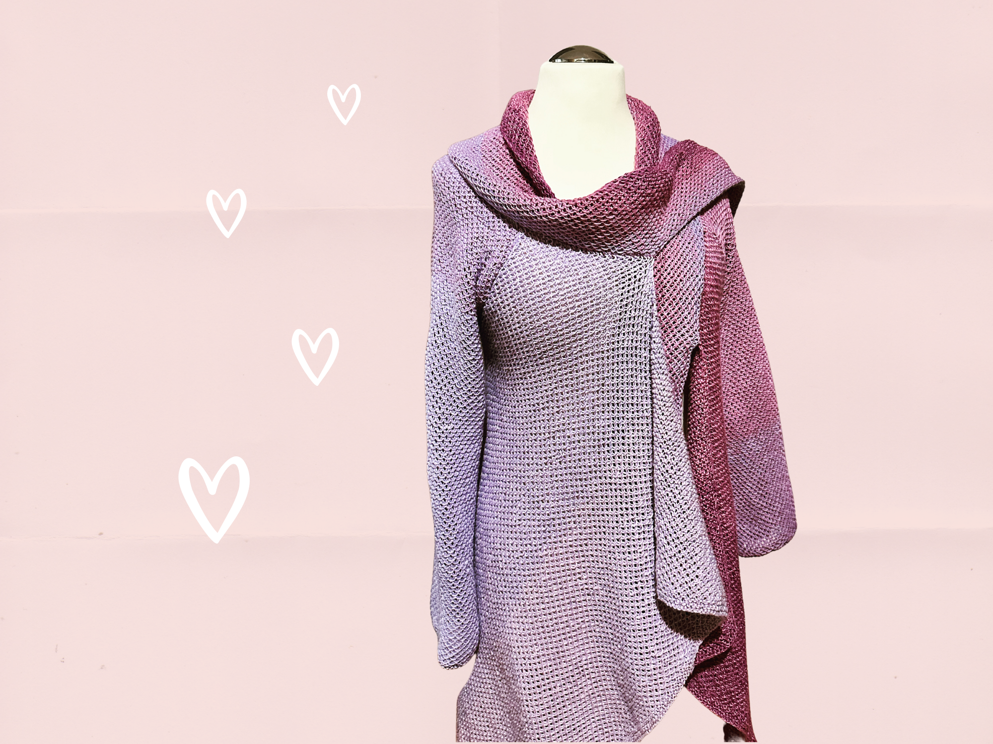 Hier wird von Seite zu Seite gestrickt. Das gibt dem Farbverlauf des Garns ein tolles Erscheinungsbild. Auch die Ärmel passen sich in den Farbverlauf ein. Der Schalkragen wird mit den Ärmelbobbeln gestrickt und bildet dann nochmal den gesamten Farbverlauf ab.