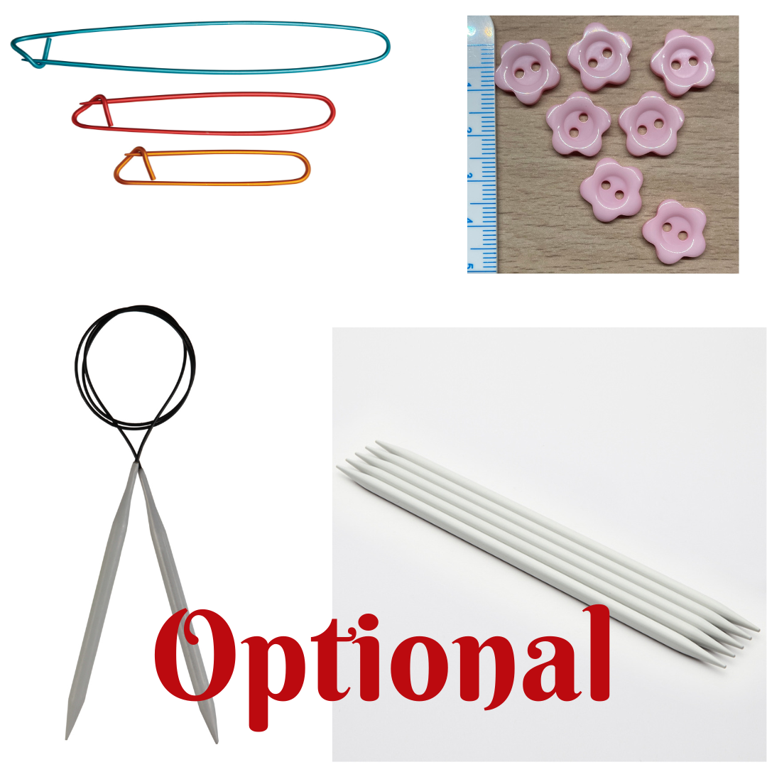 Um dir einen reibungslosen Start zu ermöglichen, bieten wir dir die Möglichkeit, eine Rundstricknadel (80 cm) und ein Nadelspiel (20 cm) aus der hochwertigen Basix-Serie von KnitPro direkt mitzubestellen. Ein Maschenhalter von KnitPro erleichtert ebenfalls das Stricken. Für die Bündchen empfehlen wir die kleinere Nadelgröße, und die Knöpfe, die du für das Jäckchen benötigst, liegen ebenfalls bereit.