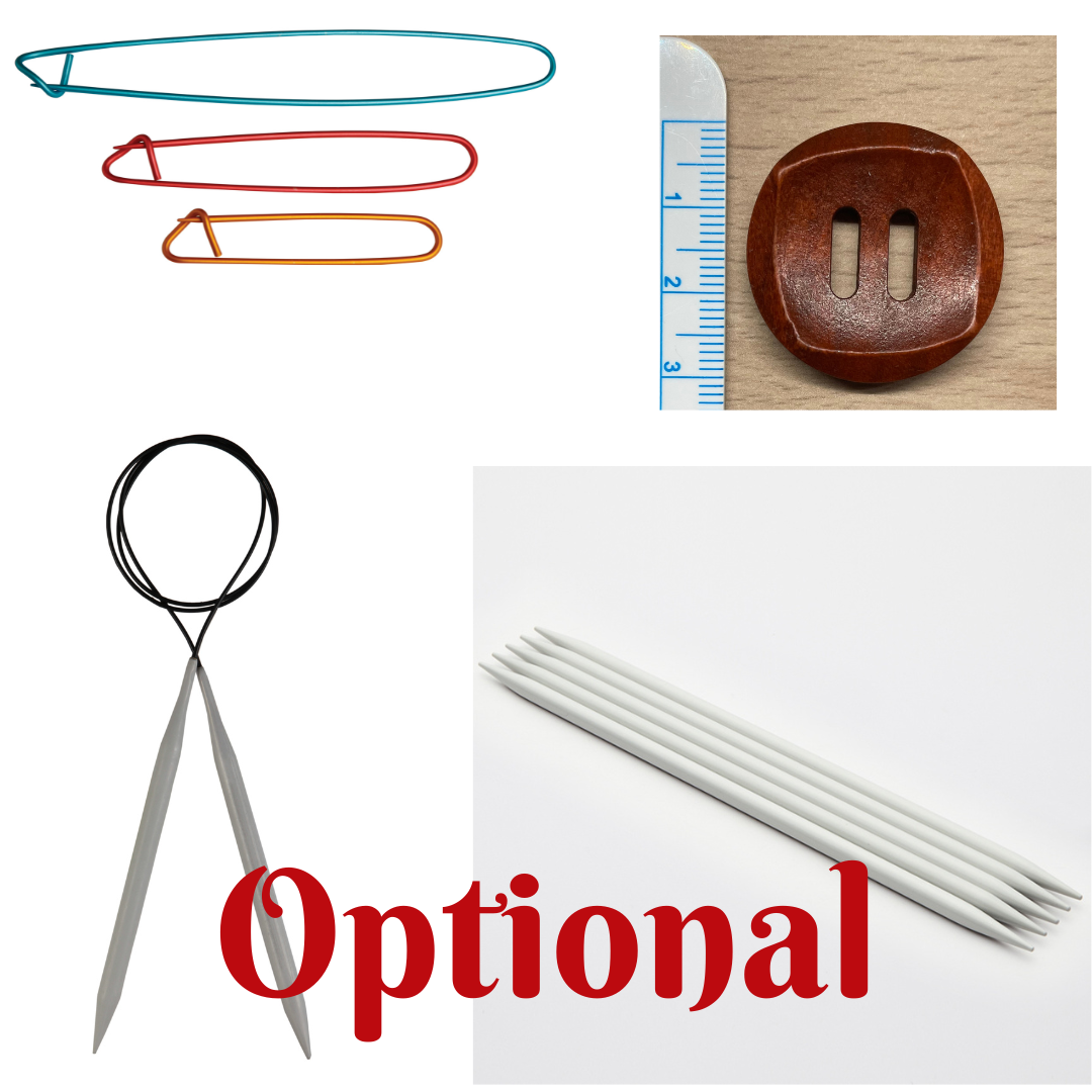 Um dir einen reibungslosen Start zu ermöglichen, bieten wir die Option, eine Rundstricknadel (80 cm) und ein Nadelspiel (20 cm) aus der hochwertigen Basix-Serie von KnitPro direkt mitzubestellen. Zudem kannst du auch einen Maschenhalter von KnitPro in dein Paket aufnehmen. Für die Bündchen empfehlen wir, auch die kleinere Nadelgröße mitzubestellen. Ein Knopf liegt ebenfalls für dich bereit.