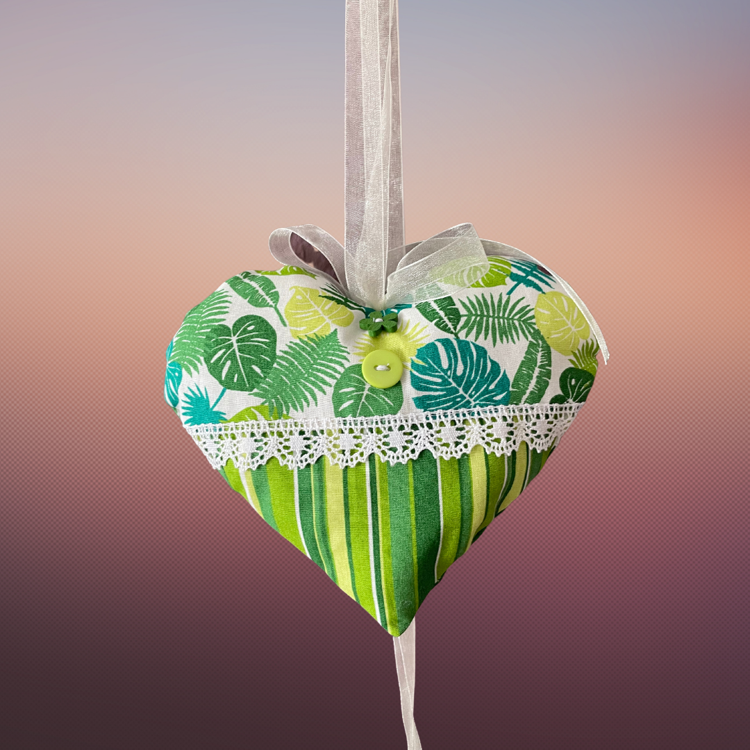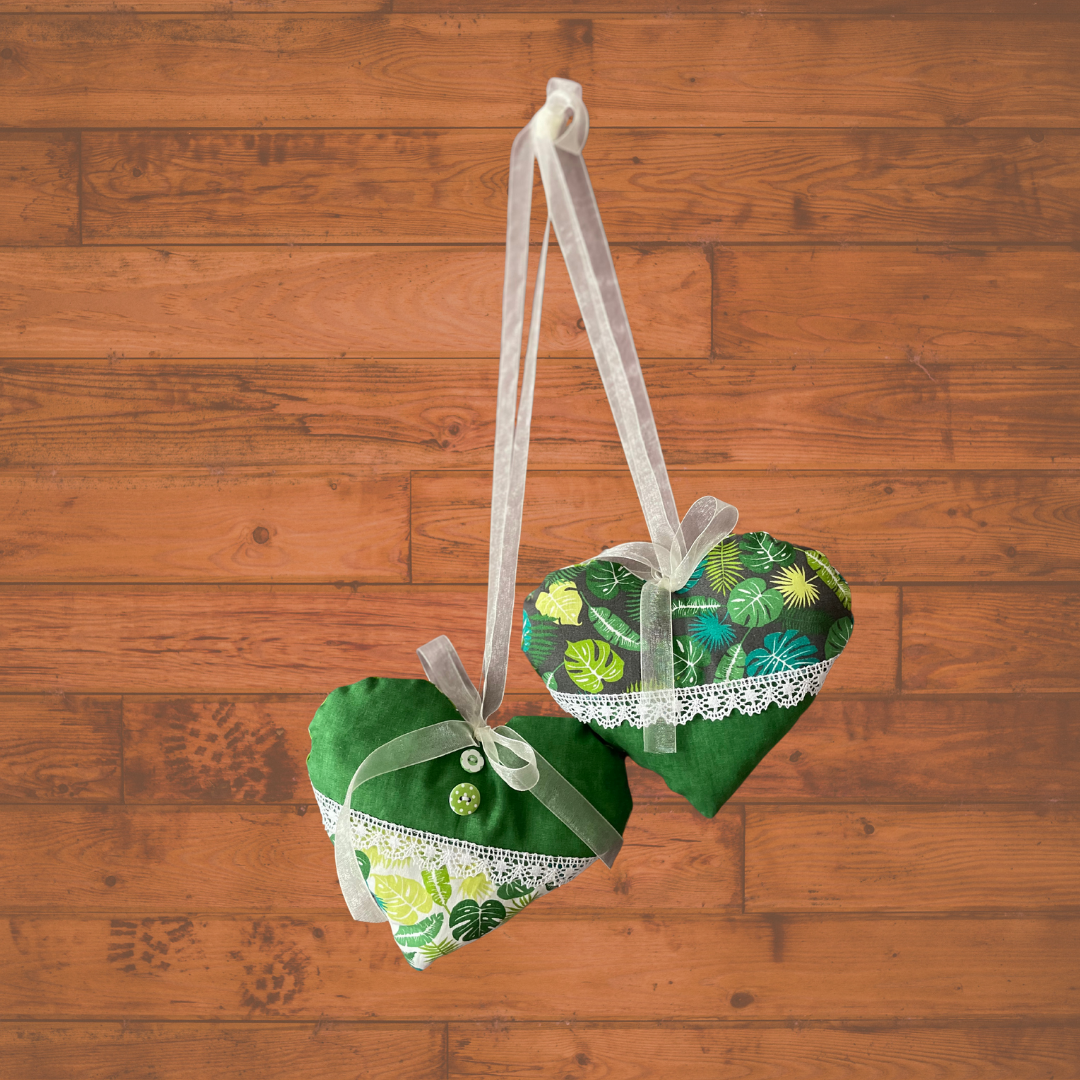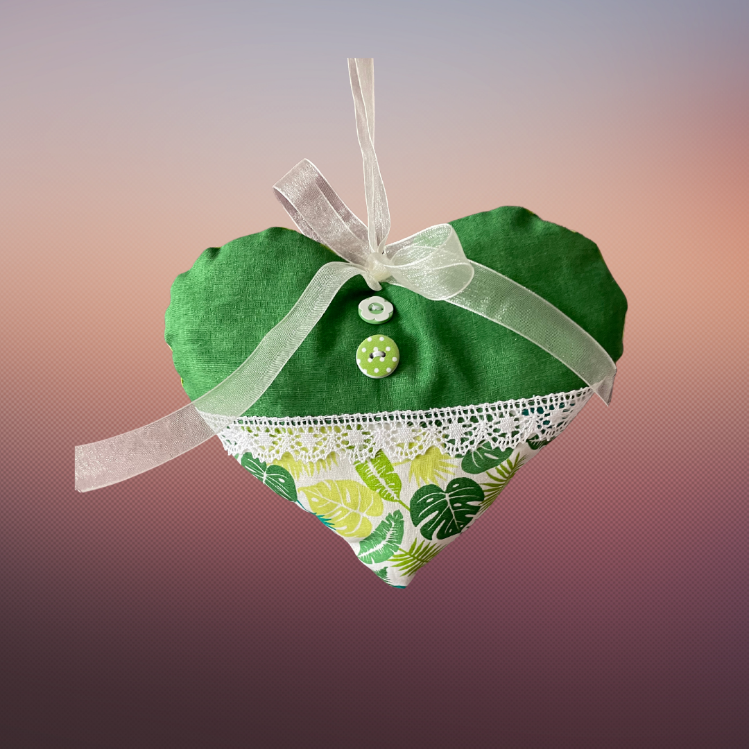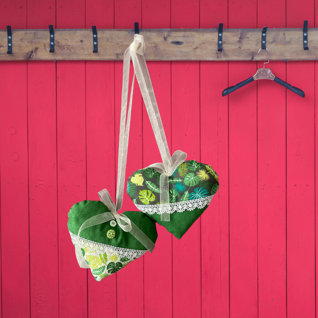 Du erhältst ein 2er-Set aus Baumwolle in Grüntönen, gefüllt mit Bastelwatte. Auf jeweils einer Seite zieren zwei Knöpfe das Herz. Die Häkelborte ist ebenfalls aus Baumwolle. Die Herzen sind 17x14x5 cm groß.