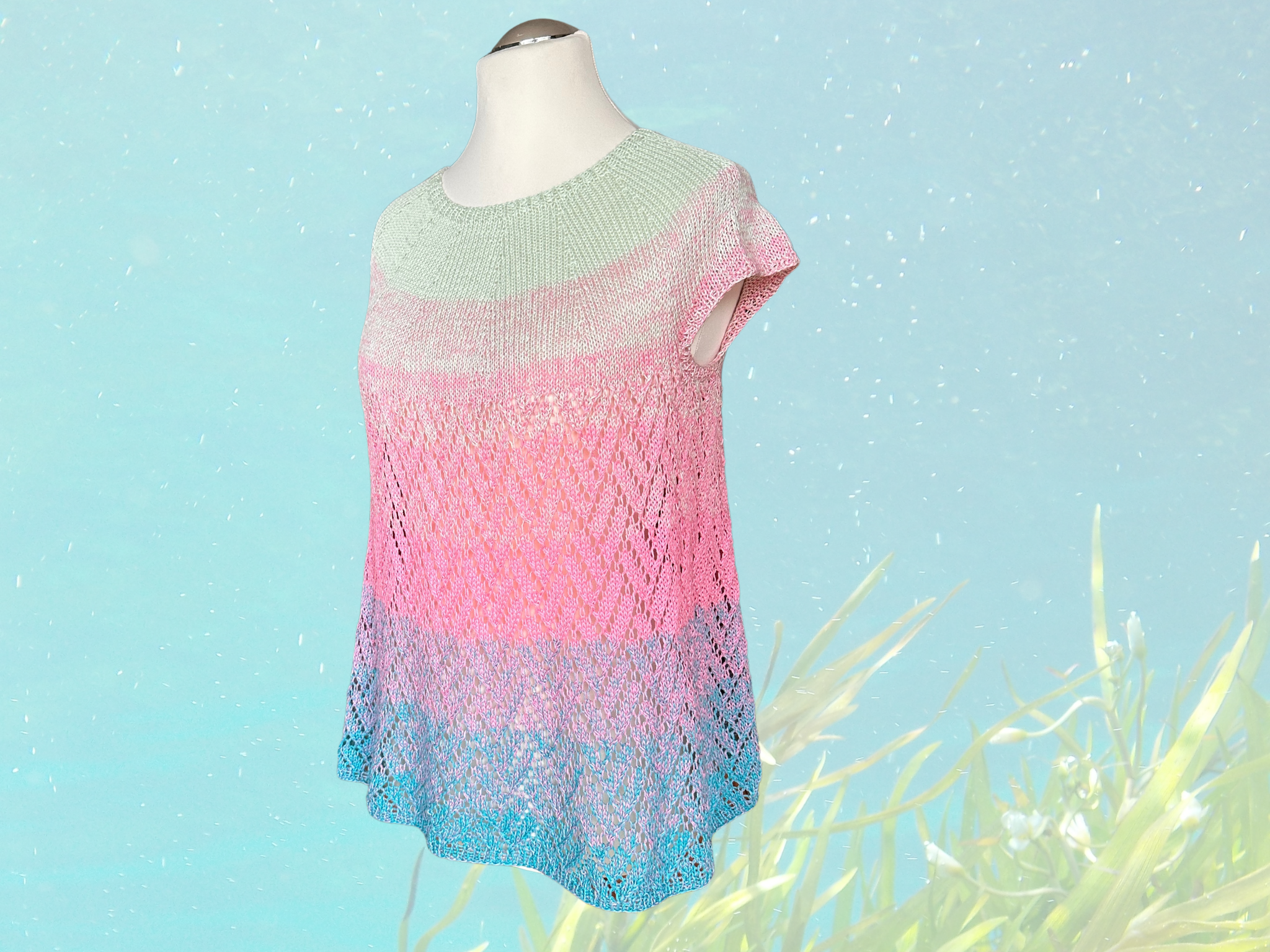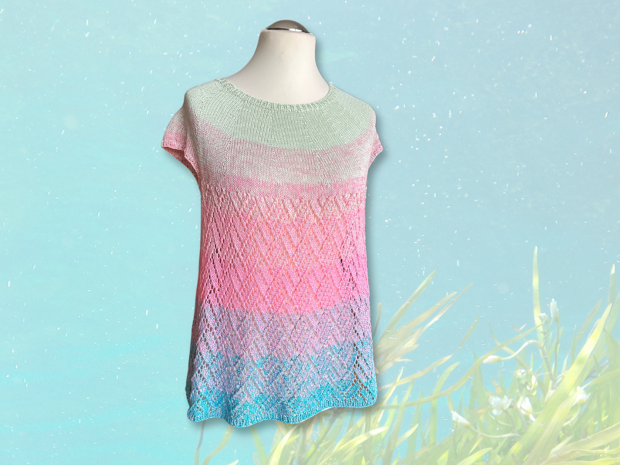 Diese luftige Tunika erinnert an sanft wiegende Seegraswiesen im klaren Wasser. Die Kombination aus glatt gestrickter Rundpasse und filigranem Ajour-Muster verleiht ihr eine elegante Leichtigkeit – perfekt für warme Tage. Dank der nahtlosen Strickweise von oben nach unten entfällt das Zusammennähen, und du kannst die Länge individuell anpassen. Die feinen Musterlinien wirken wie Lichtreflexe auf der Wasseroberfläche und machen jedes Garn mit Farbverlauf zu einem besonderen Hingucker. Hol dir mit dieser Anleitung ein Stück Urlaub ans Strickprojekt und genieße das meditative Stricken!