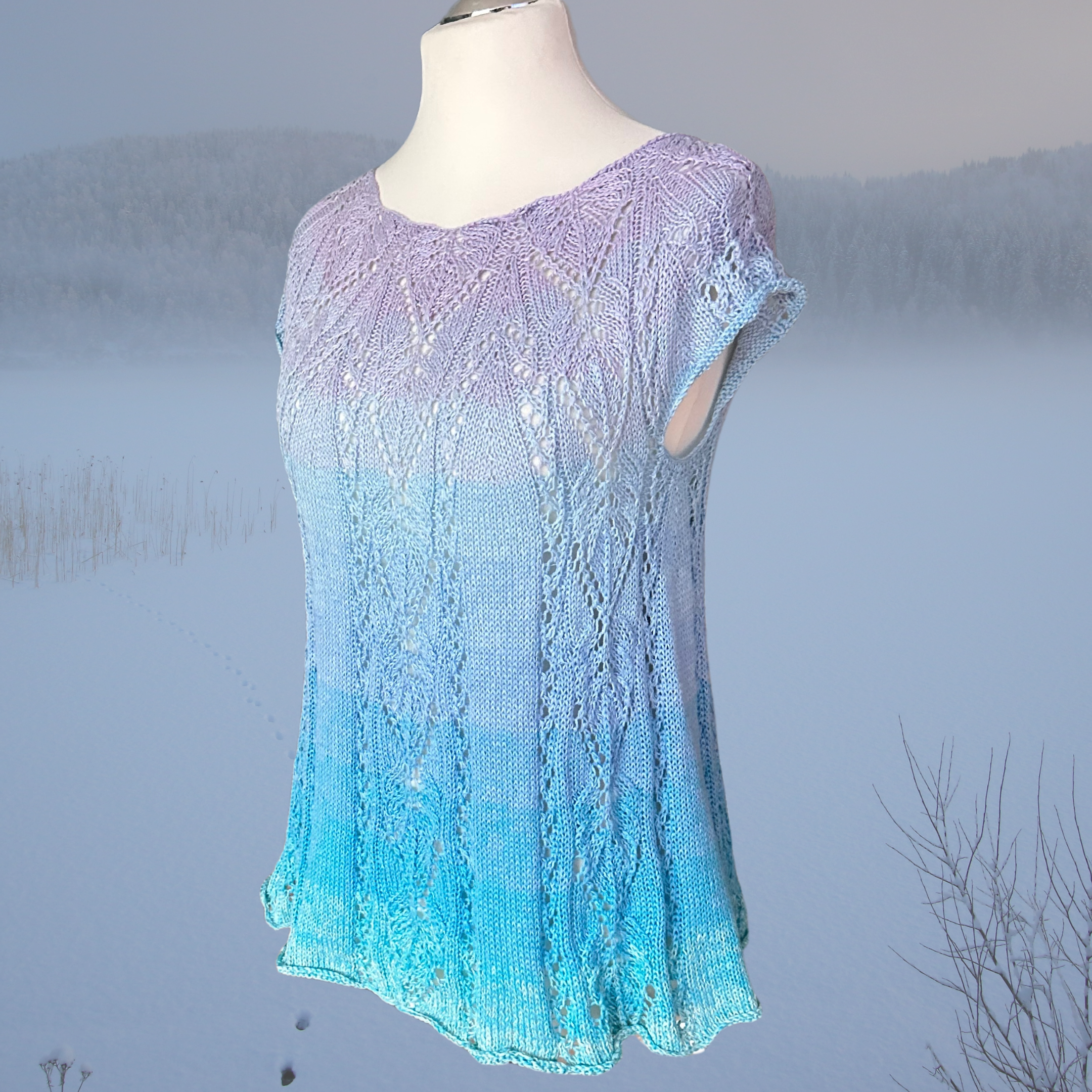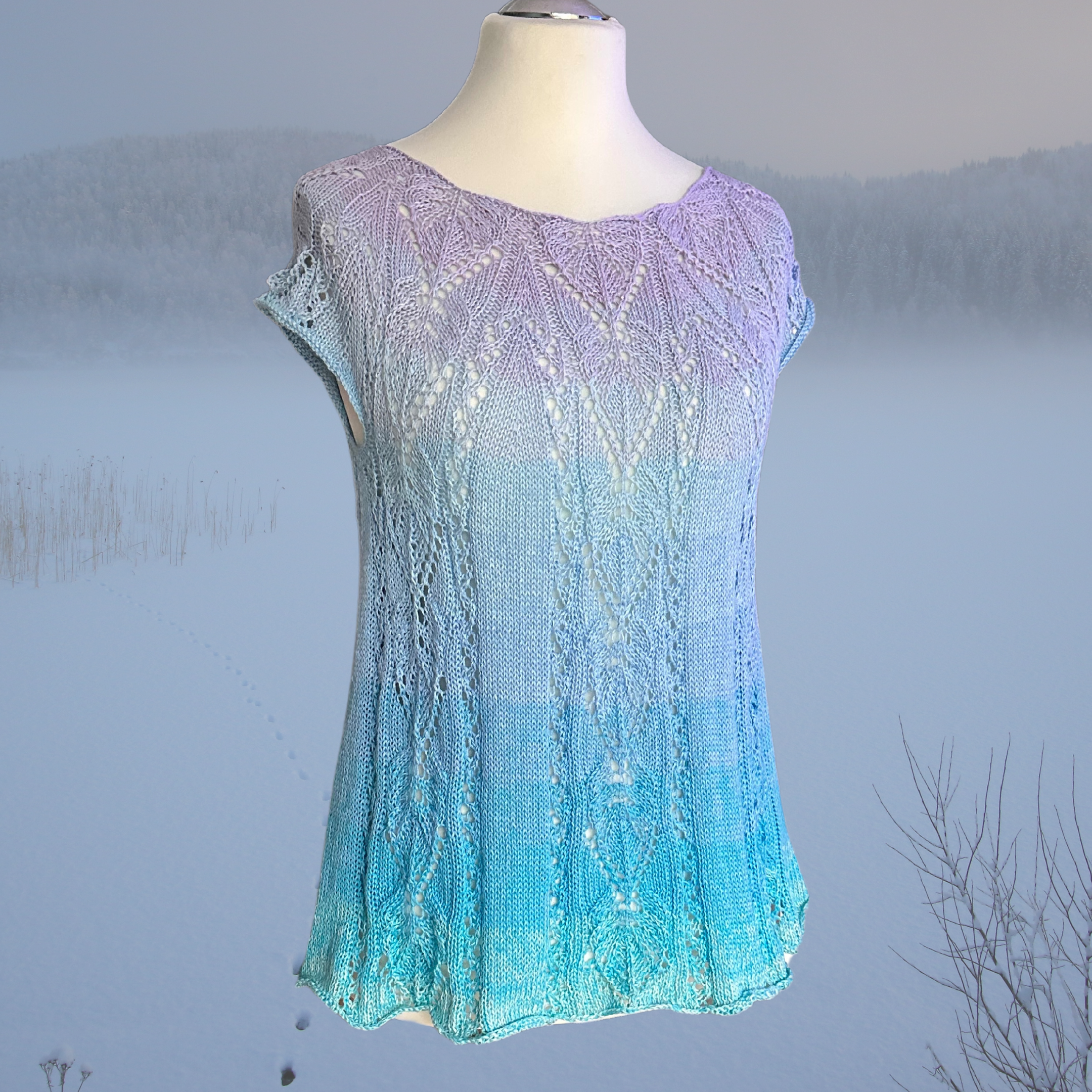 Ein traumhaft leichtes Oberteil, das die kühle Eleganz eines winterlichen Sees widerspiegelt! Dieses Tunika-Design besticht durch ein raffiniertes Muster, das an zarte Eiskristalle erinnert. Es wird nahtlos von oben nach unten in Runden gestrickt, mit eleganten Zunahmen, die das einzigartige Muster formen. Die luftige und schmeichelhafte Passform macht es zu einem vielseitigen Kleidungsstück, das sowohl lässig als auch elegant kombiniert werden kann.